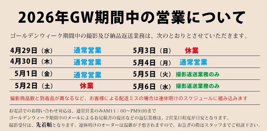 ・撮影の混雑状況により配送のタイミングを個別にしてさせて頂く場合がございます。